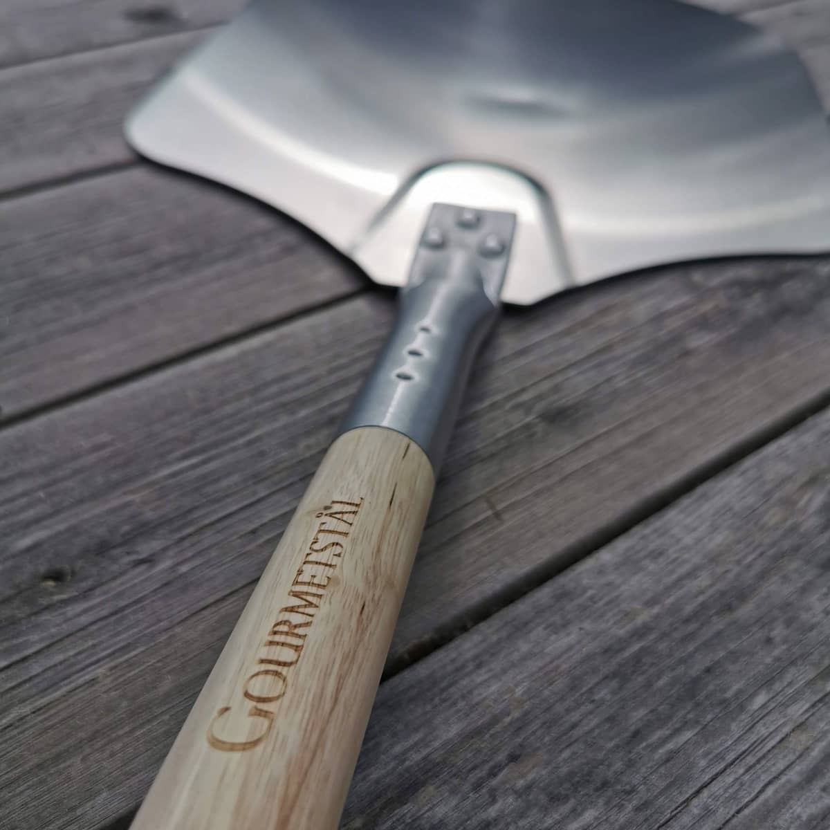 Gör som de gör i Neapel och lyft ut din färdiga pizza ur ugnen eller från grillen med en autentisk pizzaspade. Detta eleganta exemplar från Gourmetstål är tillverkat i kraftigt aluminium med behagligt skaft i trä. Skaftet är dekorerat med Gourmetståls logga och utrustat med en praktisk krok för upphängning.