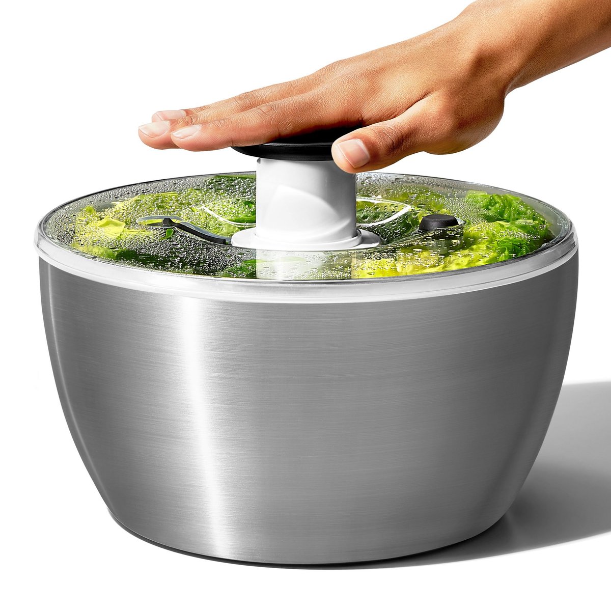 Med denna salladsslunga kan du snabbt och enkelt skölja och slunga din sallad för en färsk och elegant servering. Det enda du behöver göra är att trycka på knappen för att starta och använda bromsknappen när den ska stoppas. Här finns en yttre skål som samlar upp vattnet och gör salladen redo för servering. Nu kan du rengöra och servera salladen på ett enkelt, snabbt och effektivt sätt.
