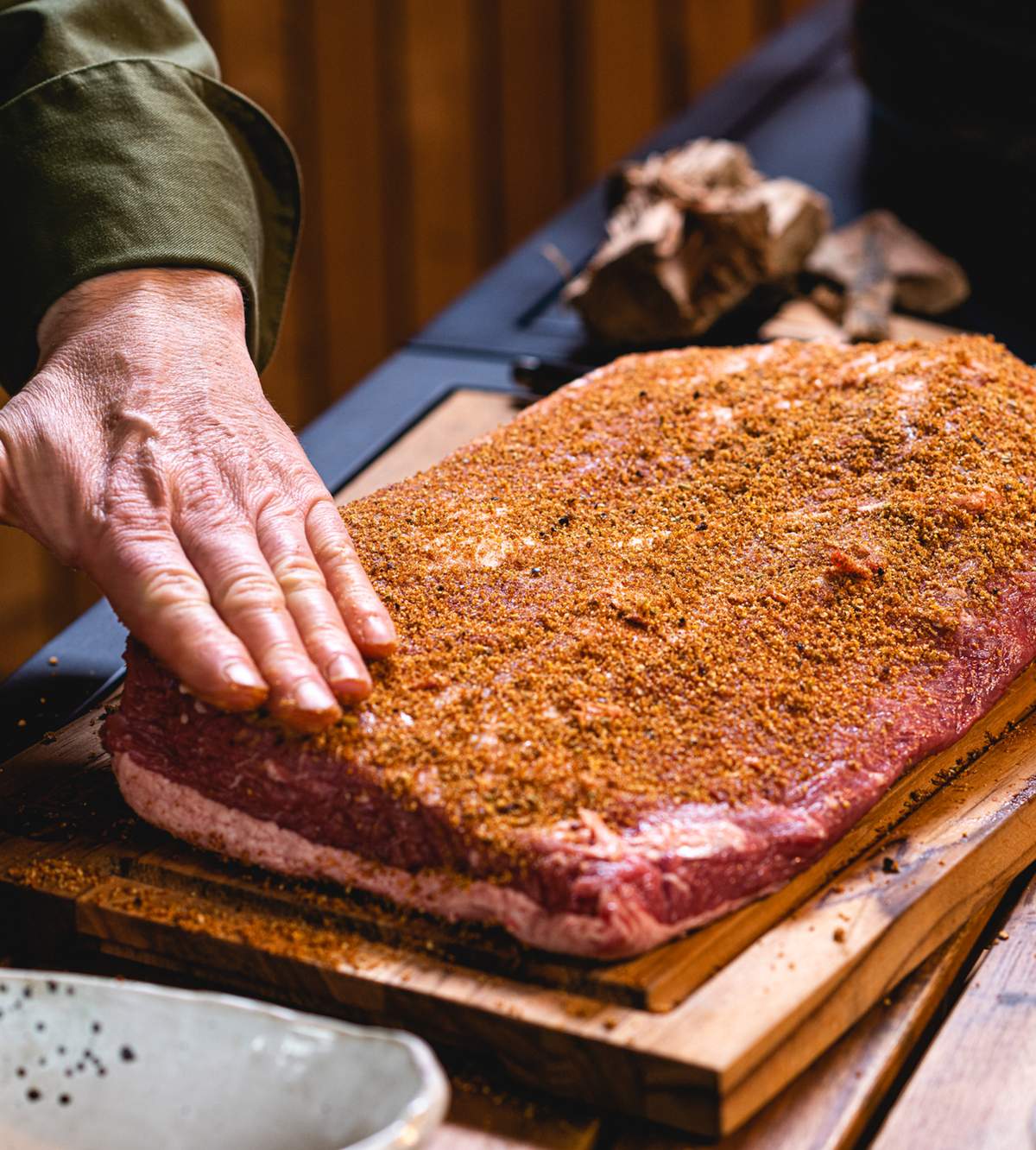 Wet rub – en pasta-liknande blandning av torra kryddor och lite vätska (t.ex. olja eller senap) som man gnuggar in på köttets yta. Skapar en fin bark/skorpa.