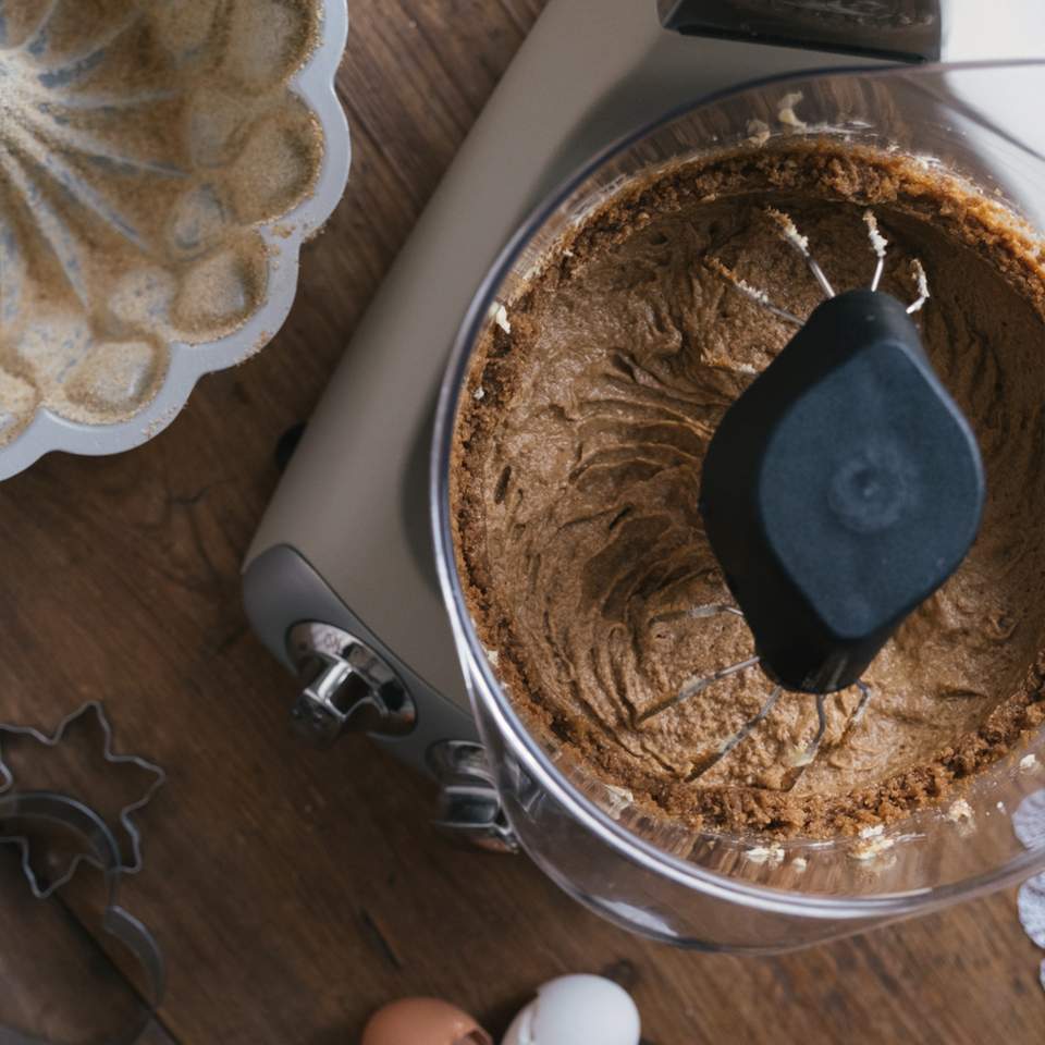 Montera vispen i motorhuvudet och rör ihop smör, sirap och strösocker. Tillsätt kryddor, bikarbonat och vatten och rör ihop även det.