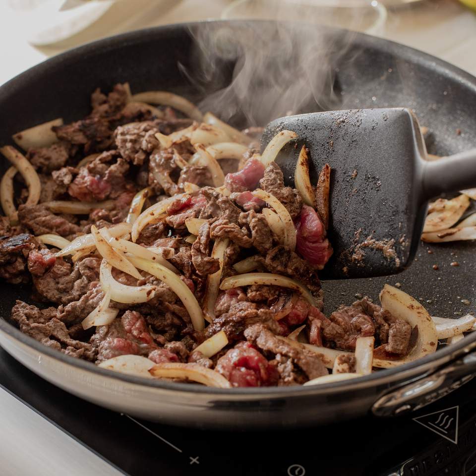 Använd en bra stekpanna med stor stekyta och jämn värmefördelning. Det ger den perfekta brynta ytan på köttet.
