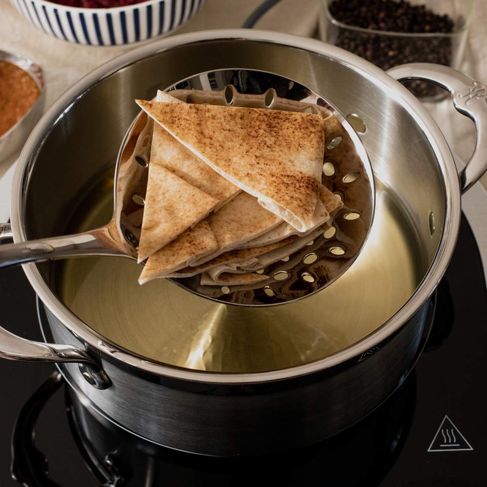 Ha ett lock nära till hands när du friterar pita-chips. Om oljan skulle börja bubbla för mycket kan du snabbt kväva elden, en enkel men viktig säkerhetsåtgärd.