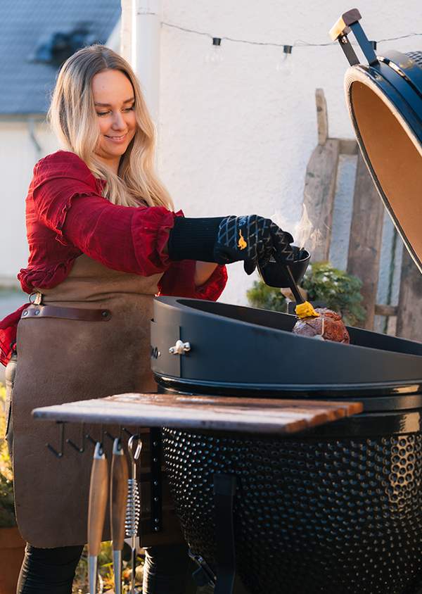 sin Kamado Sumo. Hon gör sin glace med julmust och serverar julskinkan i ett mjukt tunnbröd med hemgjord