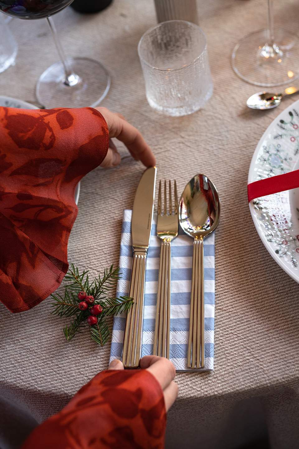 För att ge dukningen lite färg och karaktär har vi använt pappersservetter som matchar de blå tonerna i tallrikarna. En enkel, stilfull vikning lägger till en färgklick och skapar kontrast mot porslinets mönster. Placera servetten under besticken för en avslappnad och välkomnande känsla.