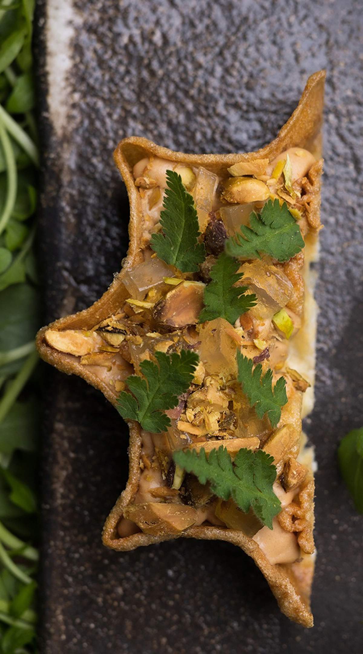 Vänd struvan uppochned så du får den ihåliga sidan uppåt. Fyll därefter ihåligheten med anklevermoussen, skär ut små tärningar av gran- & kvannegelén och fördela ut ovanpå tillsammans med några friterade blad av jordrevan.