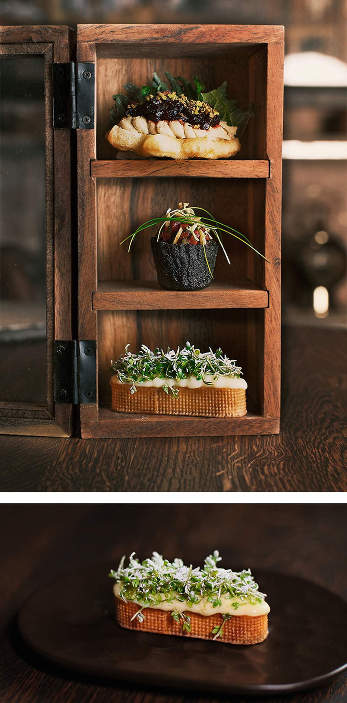 Med skånsk anklevermousse, gran- & kvannegelé samt friterad jordreva