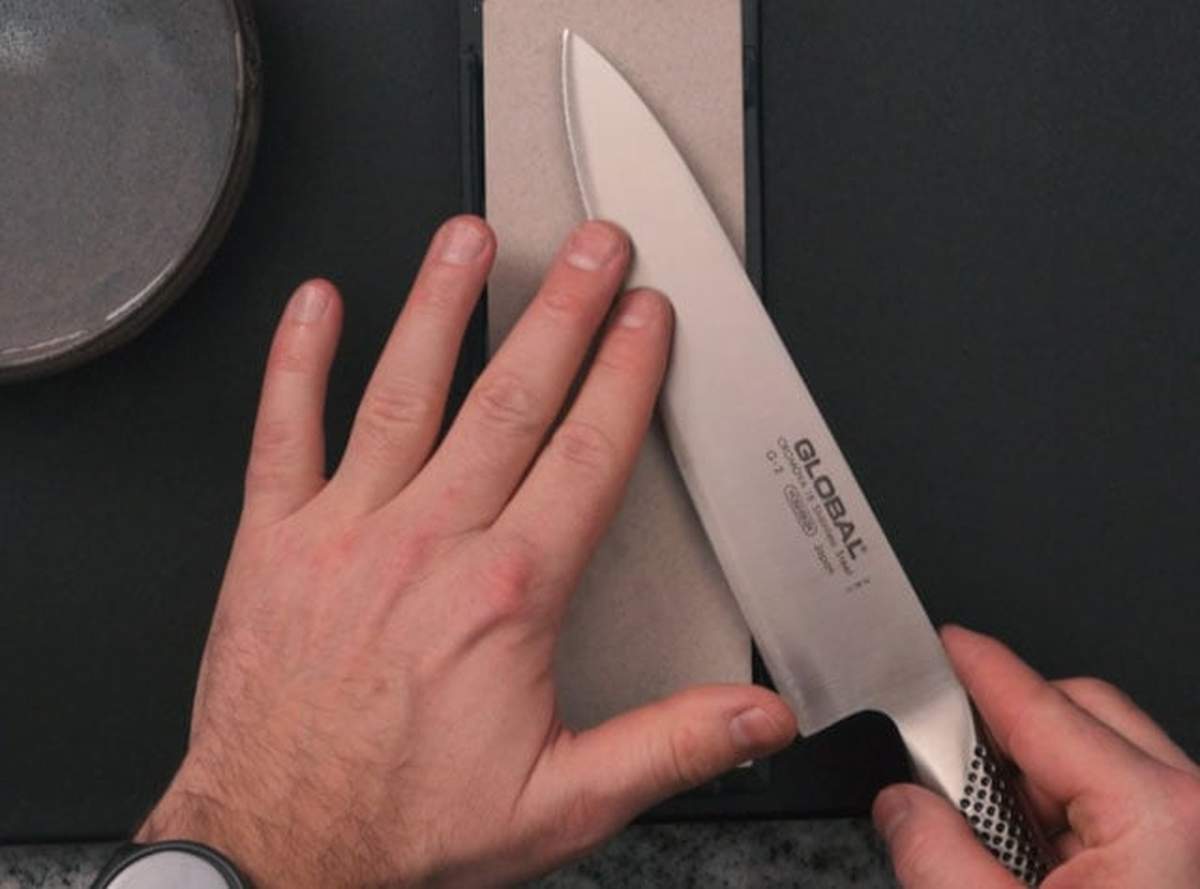 Risken att du slinter är mycket större om kniven är slö. För att se om kniven är slö ska du hålla den med knivspetsen mot dig och titta på själva eggen. Ser den ut som ett U är det dags att slipa. Du börjar i övre kanten av U:et och slipar på båda sidor tills det bildats ett V. Ska man vara riktigt petig bör vinkeln mellan spetsarna på V:et vara cirka 25 grader. Men det är inte rocket science, bara du har rätt slipdon. Ett annat enkelt knep är att skära lite i en tomat, så fort det är minsta lilla problem att komma igenom skalet är det dags för slipning. Du kan till exempel använda dig av en klassisk slipsten med olika grovlekar, ungefär som en nagelfil där man först formar nageln med den grovkorniga sidan och sedan avslutar genom att finputsa med den finkorniga. Det finns också slipar med olika hjul – grov, medel, fin – som du drar kniven i.