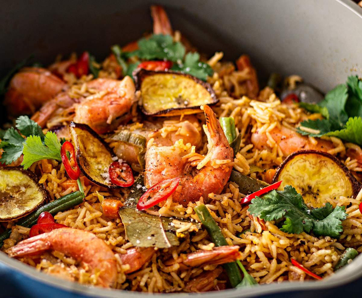 Denna smakrika västafrikanska jollof rice med scampi kombinerar krämig kokosmjölk och fräscha grönsaker i en färgstark rätt!