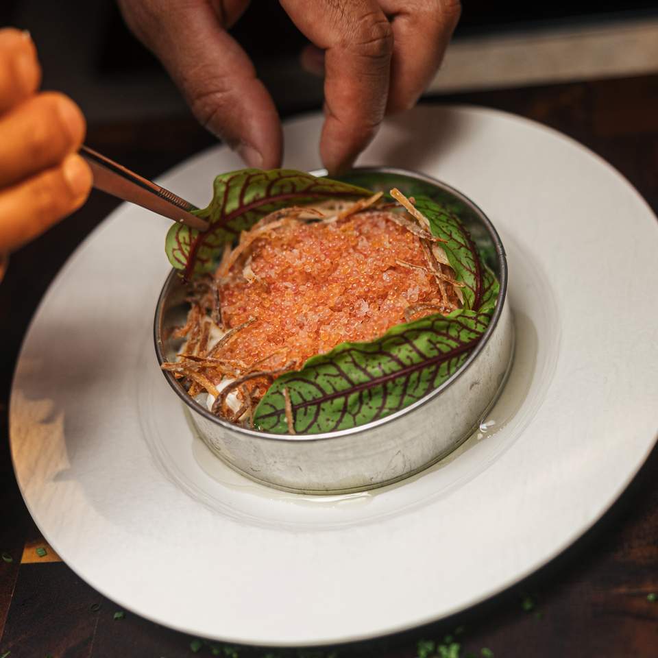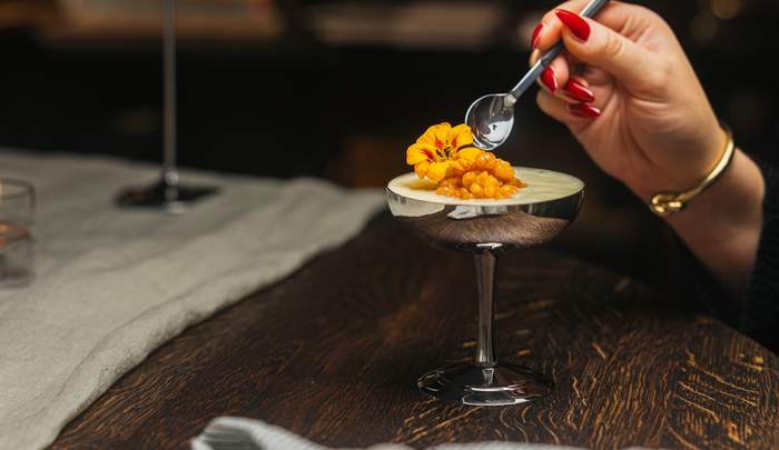 Detta är en nordisk variant på denna klassiker, men där fisken istället syras med rosenkvittenjuice och sedan toppas med hängd gräddfil och handvispad stenbitsrom. Den handvispade stenbitsrommen är väl värd att testa och överraska med på tallriken istället för till exempel löjrom. Din fiskhandlare kan säkert ordna en fryst burk och de vackert rosaskimrande fiskäggen med härlig krispig sälta lämnar sällan någon besviken. Skulle det vara svårt att hitta rosenkvittenjuice och handvispad stenbitsrom fungerar det bra att även använda citronjuice och löjrom.