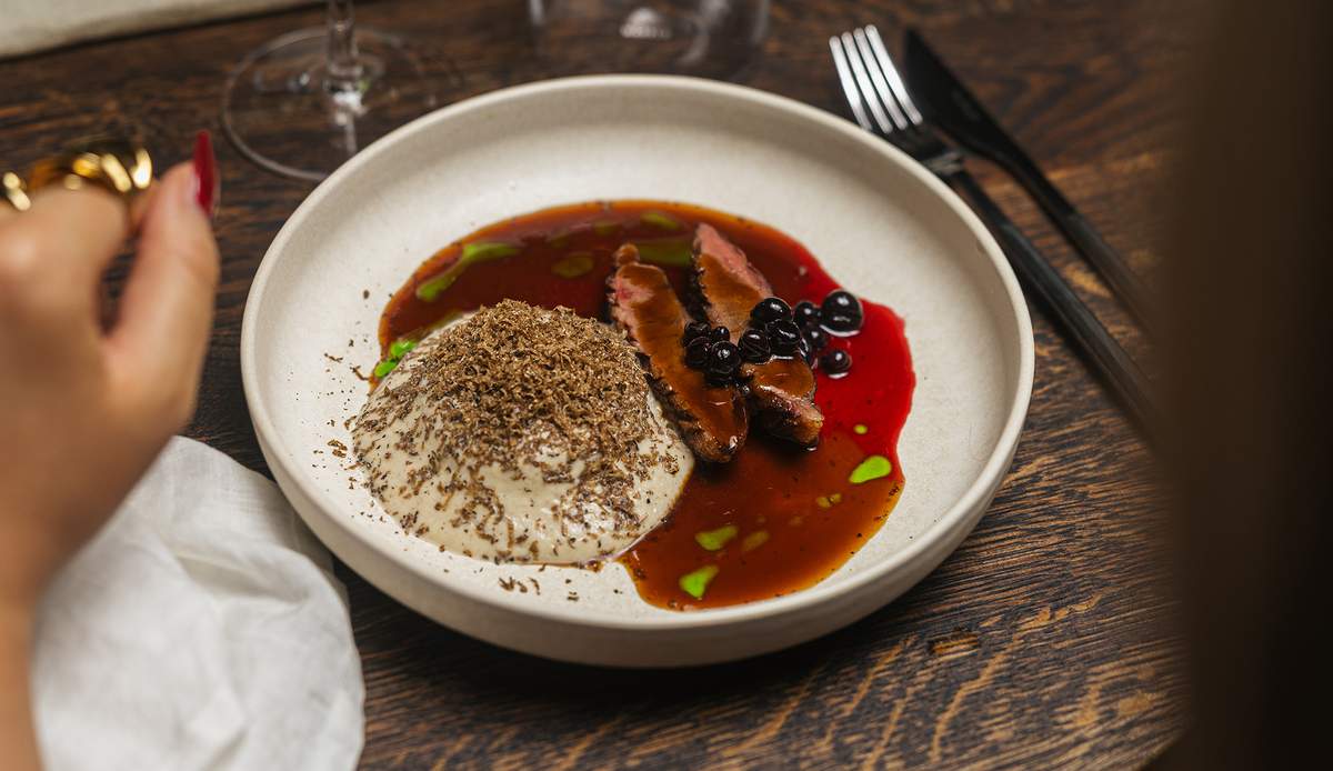 Vildand med aronia- & lavendelsky, svarvad potatis, rostat jordärtskocksskum, färsk tryffel samt inlagda svarta vinbär