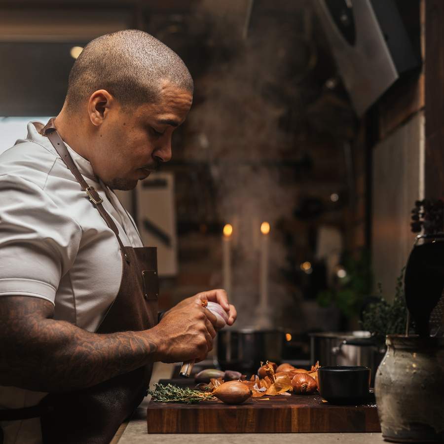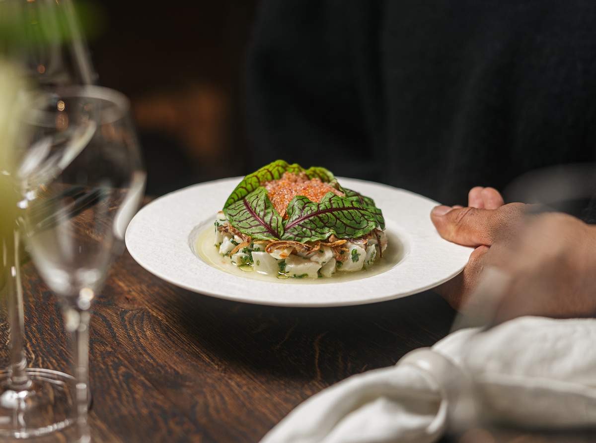 Tillsammans med aronia- & lavendelsky, svarvad potatis, rostat jordärtskocksskum, färsk tryffel samt inlagda svarta vinbär