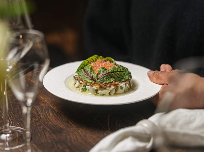 Tartar på Hälleflundra med äpple, rosenkvitten, gräddfil, handvispad stenbitsrom, gräslök och björkolja