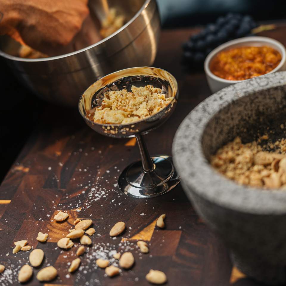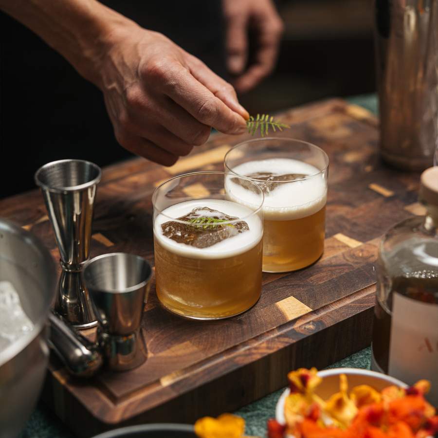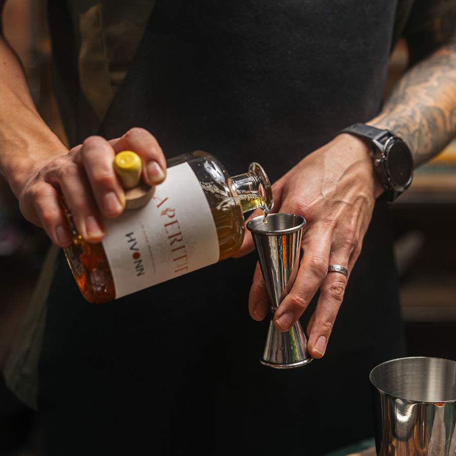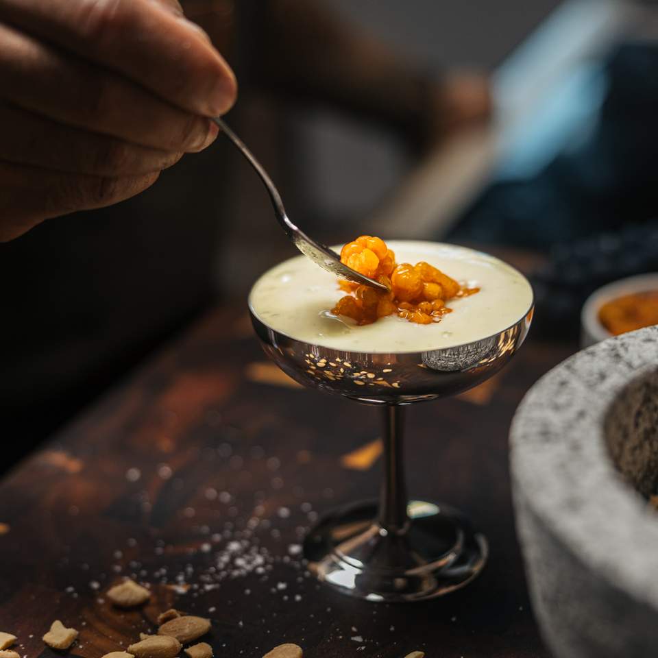 För att avsluta middagen på topp och med ett festligt dryckesalternativ tycker vi att en drink gör sig bäst till desserten. Här har vi utgått ifrån Hvonn Aperitif som bas då den blir ett väldigt bra alternativ till sprit/likörer. För att balansera de bittra tonerna från aperitifen kokar vi ett sockerlag på nypon och hjortron och tillsätter lite äppelsyra för fräschör.