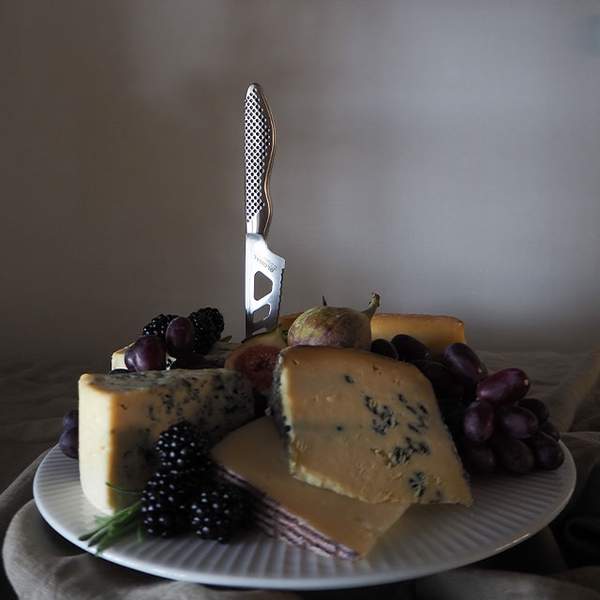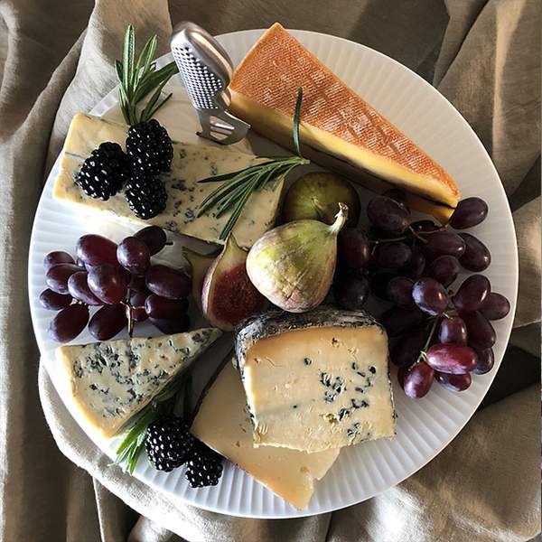 Vi komponerar med druvor, fikon och björnbär. Just björnbär och ost är fantastiskt gott tillsammans. Sötman från bären och sältan från osten liksom gifter sig tillsammans. Dessutom är det väldigt vackert tillsammans och man äter ju även med ögonen. Vi bygger gärna på höjden, ett ostfat på fot blir inte bara vackert, osten kommer också upp en bit från bordet så att det blir lättare att skära av de olika ostarna.