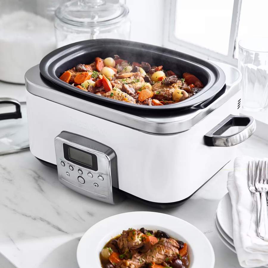 En slow cooker är en keramisk gryta som värms upp långsamt med hjälp av el. Grytan står i en ram som värmer maten under konstant temperatur. Efter tillagning övergår slow cookern automatiskt till varmhållning i 6 timmar.