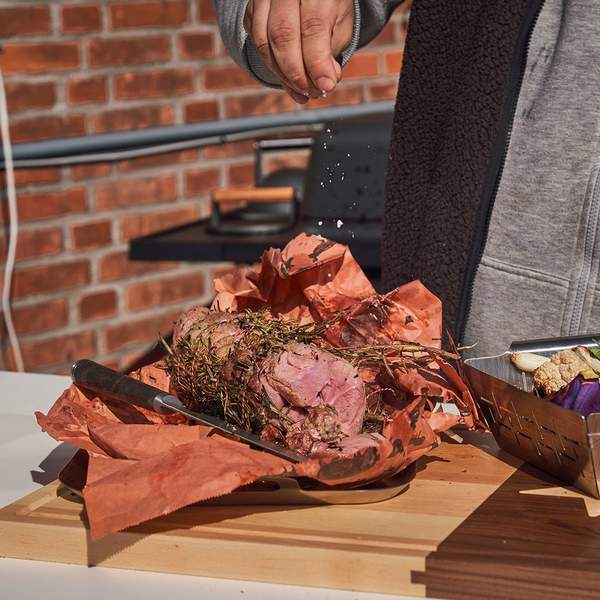 Att tillaga en hel stek på grillen kan vara ganska stressigt om du inte har provat det tidigare. Därför kan du med fördel pryla dig ur det. Börja med att lägga ett rotisseri på grillen, då kan du tillaga din stek jämnt under hela tillberedningstiden. Det kan både vara att starta förberedelsen och att bryna köttet, men du kan också använda rotisseriet hela vägen igenom. Prova t.ex. att bena ur en lammstek och sätta den på rotisseriet, knyt ihop hårt och krydda väl med örter. Ta av köttet från rotisseriet efter 45 minuter och lägga det i slaktarpapper. Det gör att köttet behåller fukten och tillagas långsamt med indirekt värme i förpackningen. Och självklart håller du ett öga på processen med din trådlösa termometer.