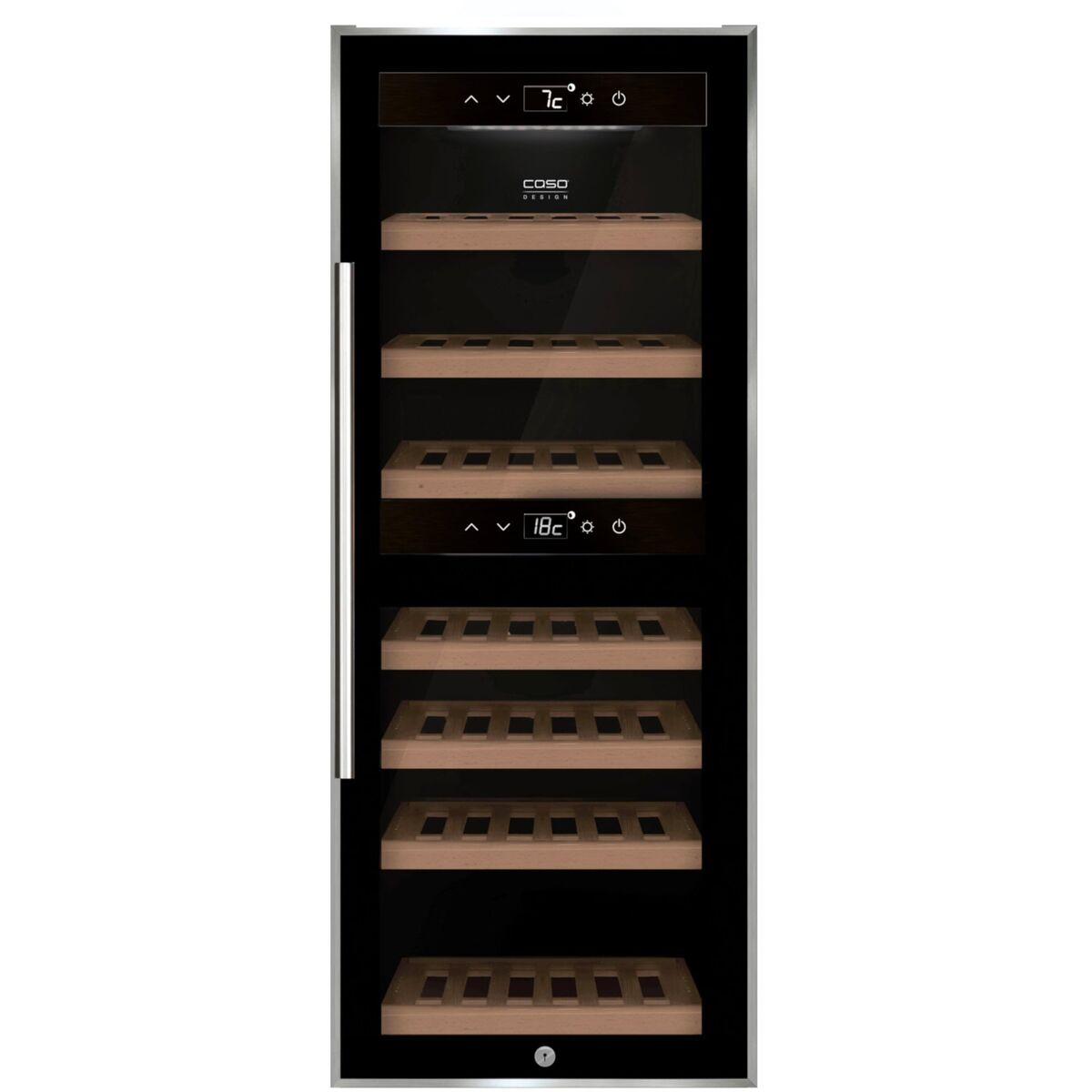 CS653 är en designervinkyl med kompressorteknologi från det tyska märket Caso. Denna eleganta vinkyl i svart har två temperaturzoner med en separat inställning för vit- och rödvin. Den har mycket tyst kompressor samt vibrationsdämpande fötter som ger ditt vin det lugn det behöver. Du kan ha upp till 38 flaskor på det otroligt eleganta trähyllorna och skåpet har invändig belysning. Temperaturen kan ställa in elektroniskt mellan 5 - 20 grader, och den aktuella temperaturen visas på kylskåpets LED-display. Glasdörren har 2-lagers isolerande UV-filter för optimalt aromskydd av vinet.