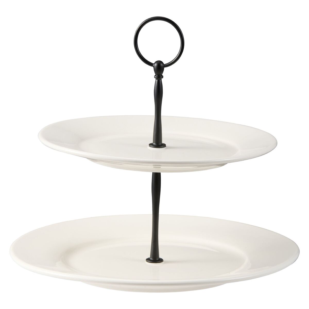 De två våningarna, var och en med en diameter på 25 cm, skapar gott om plats för allt från delikata småkakor till aptitretande fingerfood, vilket gör det perfekt för både söta och salta serveringar. Den vita porslinsytan reflekterar ljuset vackert och ger ett inbjudande och fräscht intryck, medan den diskreta metallstången ger fatet en elegant och modern siluett, samtidigt som den gör det lätt att bära och placera.