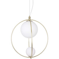 Elegant och modern lampa i stilrena former inspirerad av enkelhet. De två vita glaskloten ger intrycket av att sväva inuti de två ringarna som är tillverkade av mässingsfärgad metall. Glaskloten är vackra och ger ett behagligt ljus.