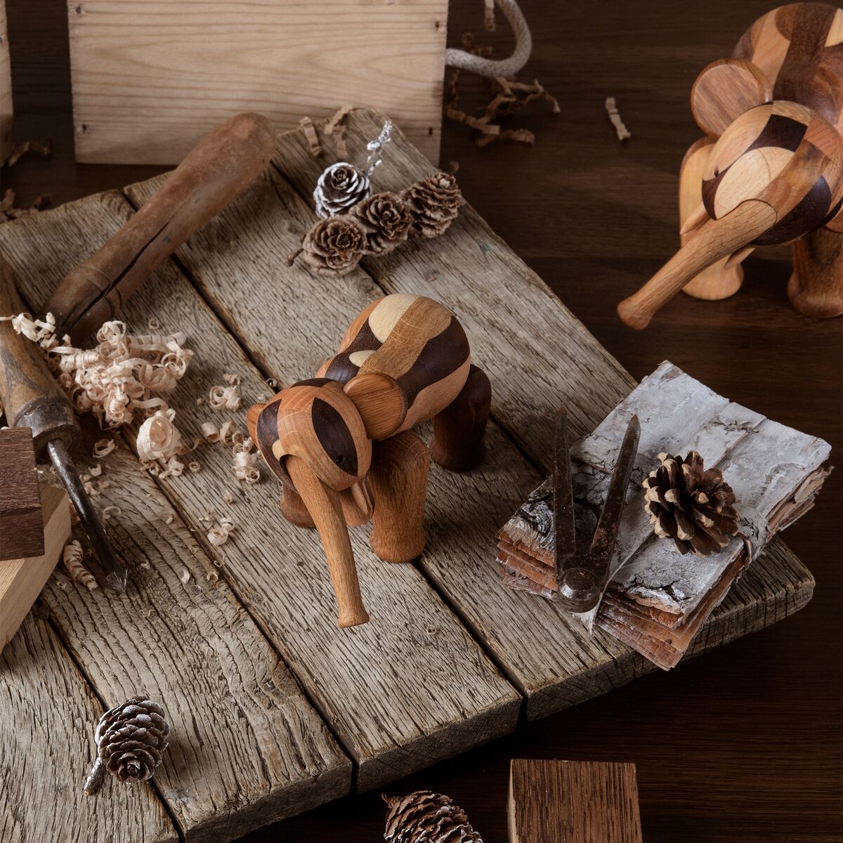 2023 är det dags för 70-årsjubileum av Kay Bojesens ikoniska och älskade elefant. Det firas med Reworked Anniversary Elephant, en unik specialutgåva som är designad med upcykling i fokus. Elefanten är tillverkad av en härlig mix av olika träslag som teak, valnöt, ek, ask och lönn. För att minska resursslöseri kommer allt material från överskott och restträ. Det gör att varje elefant är om möjligt ännu mer unik än det klassiska originalet, eftersom träslagen varierar mellan varje exemplar. Varje elefant har en 70-årsjubileumsstämpel under ena foten och levereras i en speciallåda i trä. Den finns i tre storlekar: mini, liten och stor. Den stora elefanten tillverkas i en begränsad upplaga om endast 600 numrerade exemplar.
