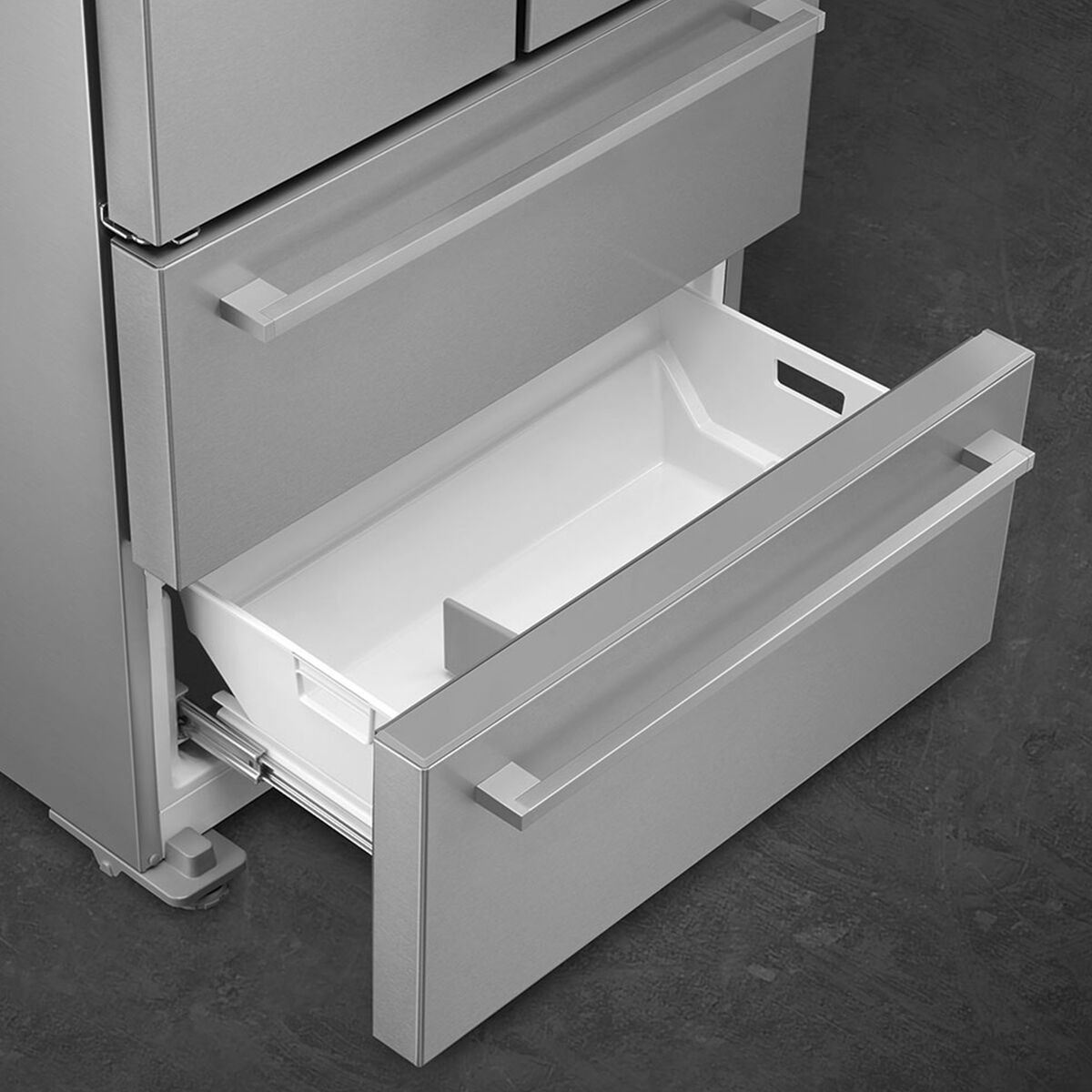 Smeg FQ55FXDE är en fristående kombinerad kyl och frys som utstrålar en känsla av "Made in Italy". Den har en elegant rostfri stålfinish som kompletterar dess universella estetik och platta design. Med två dörrar och två lådor erbjuder den en generös förvaringskapacitet och enkel åtkomst till dina matvaror. Kylskåpet är utrustat med ventilerad kylning och en No Frost-frysfunktion, vilket innebär att du slipper manuell avfrostning.