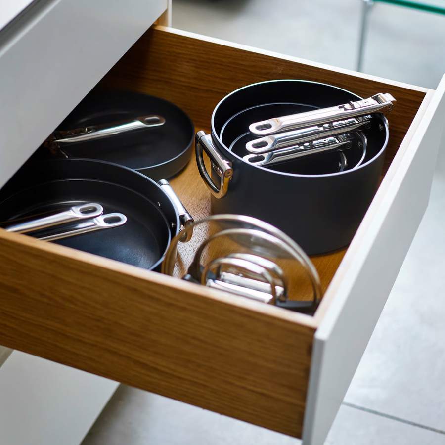 Säg farväl till röran och hej till mer utrymme i köket! Serien Space består av kokkärl har vikbara handtag som sparar upp till 50% mer utrymme än vanliga kokkärl vid förvaring. Handtaget är konstruerat i rostfritt stål för att hålla länge. De är utrustade med den patenterade mekanismen SwingLock™, som låser handtaget i säkert läge under användning och optimerar utrymmet när kastrullen är hopfälld.