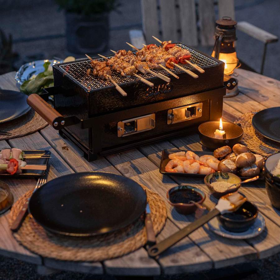 Med Sumo Hibachi bordsgrill får du en autentisk japansk grillupplevelse, förpackad i en tidlös och elegant design. Bordsgrillen passar perfekt för alla typer av sammankomster och förvandlar varje grillkväll till en yakitori-fest med vänner och familj. Grillen är tillverkad av isolerande keramik, vilket även används i kamadogrillar, och håller optimal värme för snabb och jämn tillagning av dina favoriträtter. Med två justerbara ventilationsöppningar och dubbla kolplattor får du full kontroll över luftflöde och temperatur, vilket ger en optimal grillupplevelse.