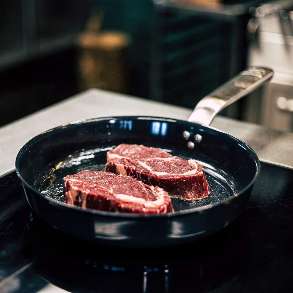 Välj alltid värmezonen efter en storlek som motsvarar stekpannans botten. Värm stekpannan långsamt med en klick matfett. Börja på en låg temperatur och öka sedan gradvis för att på så vis fördela värmen effektivt över hela ytan. När pannan är uppvärmd kan tillagningen ske på en lägre temperatur. Tänk på att om stekpannan hettas upp till över 450°C, eller för snabbt på induktion, kan det orsaka att den slår sig.
