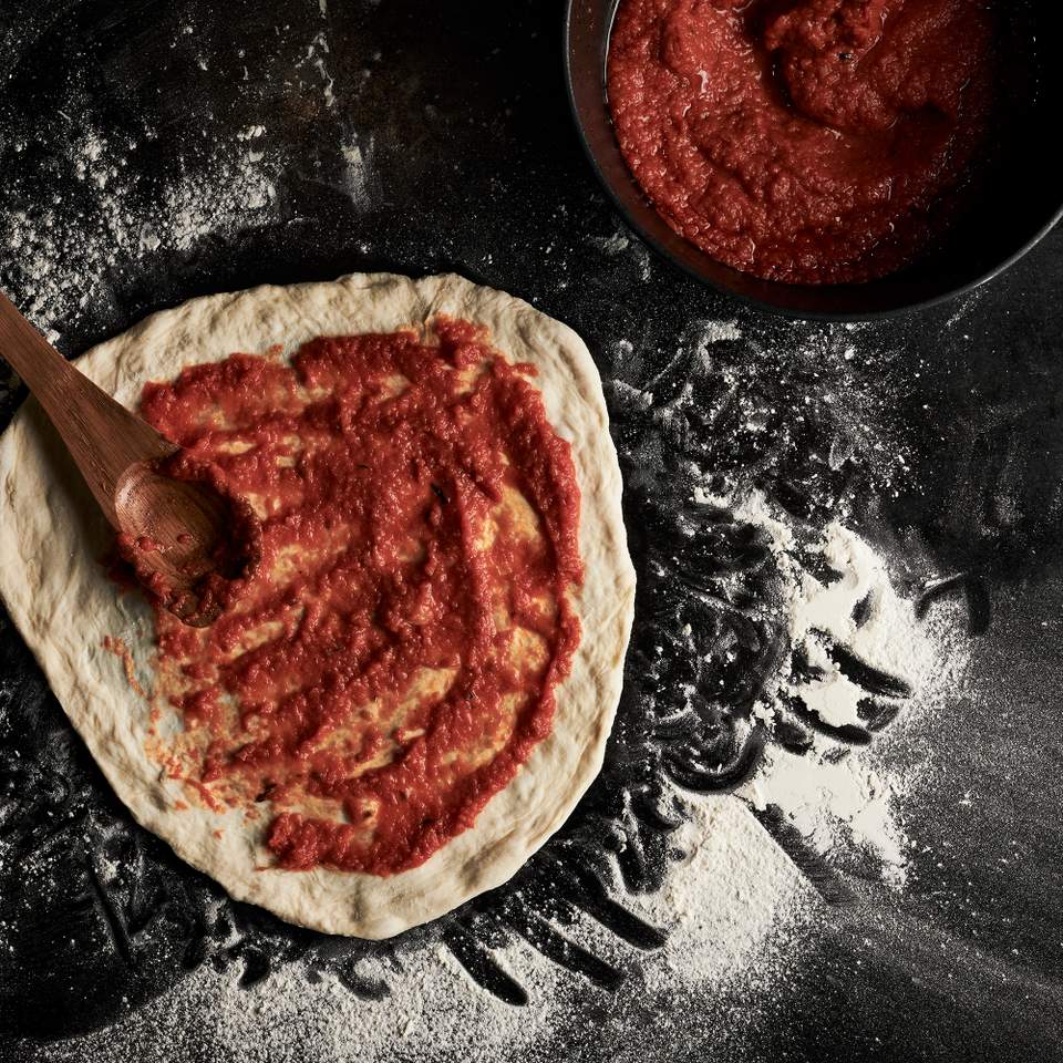 Täck över degen med en fuktig kökshandduk och låt den vila i 2 timmar. Dela upp degen i 6 portioner och rulla dem till små bollar. Lägg bollarna i en plastlåda som är tillräckligt stor för att rymma degbollarna utan att de rör vid varandra. Täck över och låt degen jäsa i 24 timmar i 16–18 grader - i ett svalt rum. Tryck ut pizzan med händerna - använd inte en kavel!