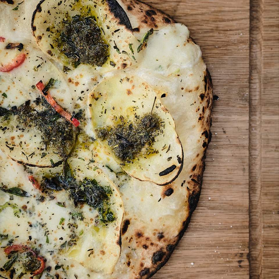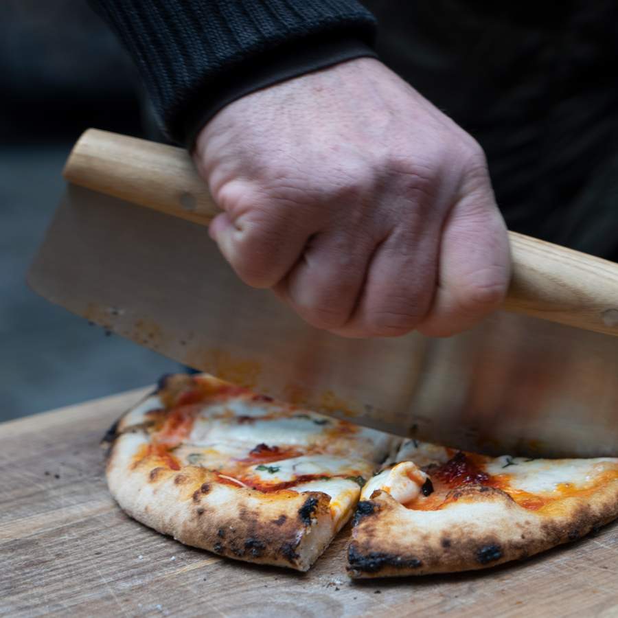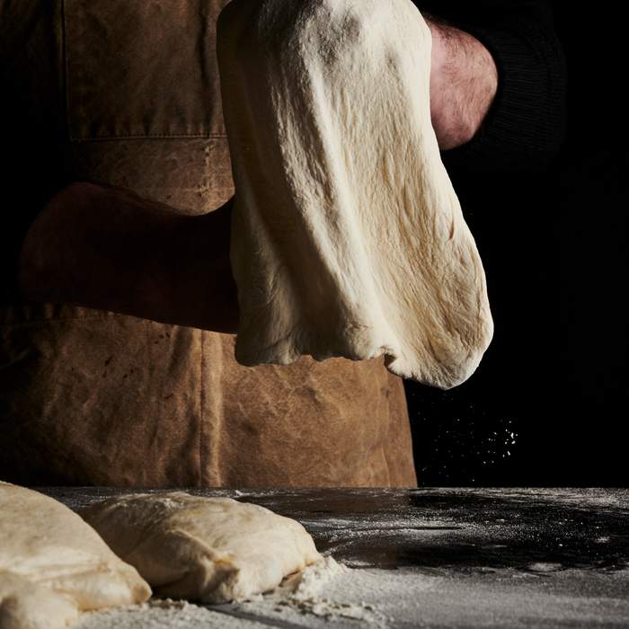 Mjöl är nyckeln till att göra den perfekta pizzadegen. Du kan använda tipo 0 eller tipo 00. Det viktiga här är proteinprocenten. Den bör vara 12,5% eller högre. Det är proteinprocenten som ger en stark glutenstruktur. Lägg vatten och salt i en skål och rör om väl, tillsätt 30% av mjölet och rör om tills allt mjöl är upplöst. Tillsätt jäst och resten av mjölet. Knåda degen i skålen tills allt mjöl har sugits upp och vänd ut degen på bordet. Knåda degen i 10–15 minuter tills degen är smidig och stark. Kärntemperaturen ska vara mellan 23 och 26 grader.