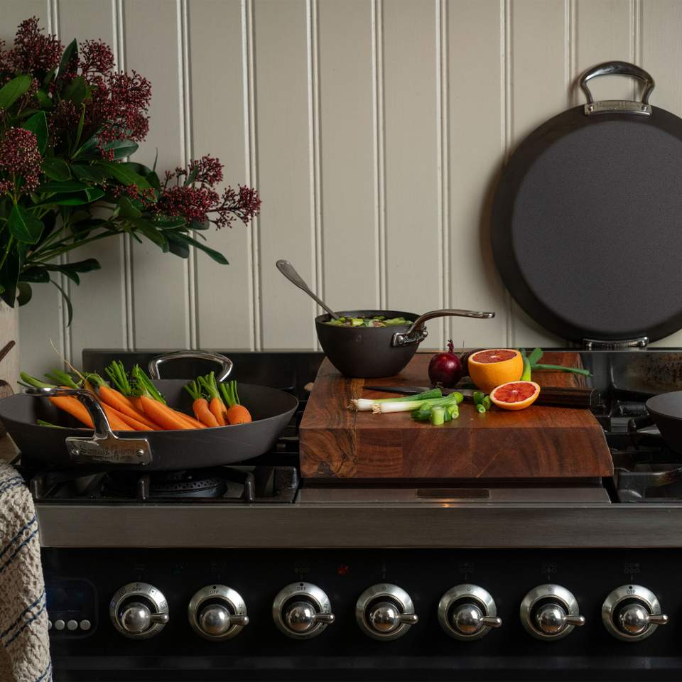 Samuel Groves arbetar med högkvalitativa material – ofta gjutjärn, kolstål eller rostfritt stål – och använder tekniker som säkerställer jämn värmefördelning, lång livslängd och gedigen känsla. Resultatet är köksredskap du kan lita på, oavsett om du står mitt i ett vardagskaos eller tillagar en helgmiddag i flera akter.